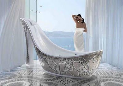 The High Heels shaped bathtub slides into a deep tub. Broad at the bottom, the tub tapers when going upwards forming the tip of the heel of the shoe.